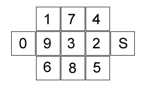 Se trasează pe sol un pătrat cu latura de 90 cm care se împarte în pătrăţele de 30 cm (9 pătrăţele), după care se mai trasează două de aceeaşi dimensiune, pe laturi opuse. Se cere sportivului ca din pătratul “0” să execute, conform numerotării, sărituri pe ambele picioare, cât mai rapid, în pătrăţelele respective, fără să omită un pătrăţel sau să calce liniile despărţitoare, până în pătratul "S" (sosire).